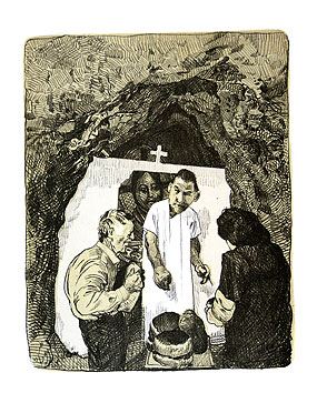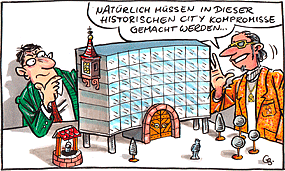 ![]() Gerd Bauer · Histrorische City Die komischen Seiten im Umgang mit Bauwerken zeigen Cartoons von Gerd Bauer, der die Altstadtfreunde mit Butzenscheibenbrillen auf Chörlein-Besichtigungstour schickt. Lustig ist auch die wahre Geschichte Johannes Grützkes, die der Berliner Maler in acht Farblithographien verarbeitet hat: Grützke hatte auf Kreta die kompletten Innenwände einer kleinen Höhle, die den Eingang zu einer Bergkapelle darstellt, ausgemalt. Das Motiv waren verschiedenen Menschen der Gemeinde, z. b. die frömmste Frau, der alte Pfarrer, aber auch viele andere. Die Bewohner des Dorfes unterstützte den Künstler insofern, als sie ihm ab und zu etwas zu Essen brachten und geduldig Modell standen. |