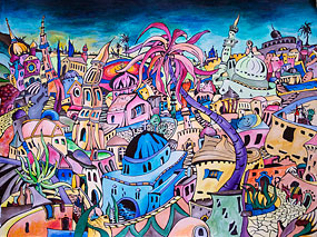 ![]() Horst Schäfer · Guggenheim Museum, New York Einen Hauch von weiter Welt aber auch das Gefühl einer Zeitreise in die Vergangenheit bringen die Fotos von Horst Schäfer in die Ausstellung. Schäfer war in den 60er Jahren Pressefotograf in New York, von wo er unter anderem beeindruckende Bilder der dortigen Architektur mitbrachte. ![]() Richard Svadrlik · Mein Jerusalem Vollkommen in eine Traum-welt führt das Bild des tschechi-schen Künstlers Richard Svandrlik, das eine orienta-lische Traum-stadt zeigt.