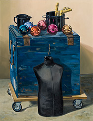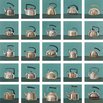 Stefan S. Schmidt · Mobiles Stillleben Der Marburger Stefan S. Schmidt ist nicht der älteste der teilnehmenden Künstler, aber doch der altmodischste, was die Motivwahl anbelangt. Schwerpunkt seiner ausschließlich völlig realistischen Ölmalerei sind Stillleben, die er mit Liebe zum Detail in oft völlig absurden Arrangements zusammenstellt. Allerdings sieht man bei Herrn Schmidt keine Blumen- oder Obstschalen-Kompositionen, sondern andere Dinge seines Alltags. Die zweite große Leidenschaft des Künstlers neben dem Malen ist das Sammeln alter Haushalts-Gegenstände, die er dann wiederum auch gerne zu Leinwand bringt. Ein etwa 2 x 2 Meter großes Werk zeigt in 25 Einzelbildern alte Teekessel aus seiner Sammlung, die aber auch alte Koffer, Schaufensterpuppen, Geschirr, Theaterstühle und vieles mehr umfasst. Neben seinem Atelier hat der Künstler auch große Lagerräume, in denen er seine Malobjekte aufbewahrt.