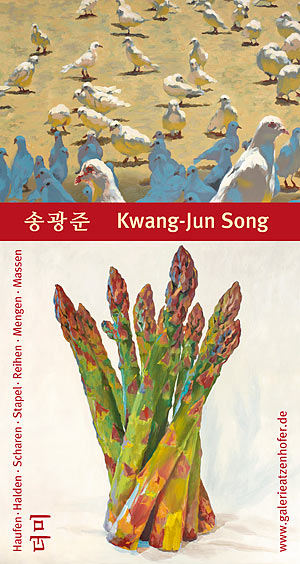 Haufen · Halden · Scharen · Stapel · Reihen · Mengen · Massen 21. März bis 25. April 2015 ![]() für Kwang-Jun Song ist „mehr“ immer besser. Der koreanische Künstler lässt Niemanden und Nichts allein auf der Leinwand stehen. Seine Ölgemälde zeigen Plätze voll gurrender Tauben, schillernde Fisch- und summende Bienenschwärme oder bunt gemischte Spielzeugtier-Versammlungen. Mit flott gesetztem Pinselstrich entstehen lecker duftende Kaffeebohnenberge, scharfe Pepperoni-Bündel, Regale voll bunter Spirituosen und meterhohe, knackig grüne Spargelstangen. Die Natur lässt sich gut zusammenklauben, aufreihen und stapeln zu malerisch aufgetürmten Holzscheit-Bergen, Muschelschalen-Halden oder lichtdurchfluteten „Steckerleswäldern“. Geldscheinhaufen, Riesen-Karussells, Bücher- und Zeitschriftenstapel runden das Angebot vielfältiger Konglomerate ab. Von Allem ist überreichlich viel vorhanden, oft in ganz beachtlicher Größe. So außergewöhnlich formlos, ungezwungen und entspannt die Malerei Kwang-Jun Songs daherkommt, so umfangreich und solide ist seine Ausbildung. Dem Kunststudium an der Chung-Ang Universität in Seoul schloss sich ein weiteres Studium der Malerei an der Nürnberger Akademie bei den Professoren Angermann und Fleck an. |