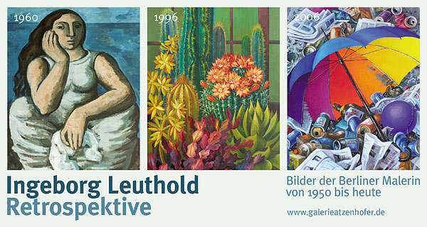 Die große Berliner Malerin Ingeborg Leuthold präsentieren zu dürfen, ist für uns eine besondere Ehre, ein Riesen-Vergnügen und eine außergewöhnliche Erfahrung, insofern als einige Gemälde der Ausstellung älter sind als wir selbst. 1925 wurde Ingeborg Leuthold geboren, eine Zeit die wir von Schwarz-Weiß-Fotografien und aus Geschichtsbüchern kennen. Im Nachkriegsdeutschland, Anfang der 1950er Jahre war sie an der Berliner Hochschule für bildende Künste Meisterschülerin bei Prof. Karl Schmidt-Rottluff, der zwar selbst ein wichtiger Vertreter des damals angesagten Expressionismus war, Leutholds konsequent realistischen Malstil aber stark förderte. Im kommenden Jahr wird die Künstlerin ihren 90sten Geburtstag feiern. Wir beginnen die Festivitäten schon jetzt. Zusammen mit Frau Leuthold haben wir für alle kunstinteressierten Nürnberger die besten Bilder aus ihrem langen Künstlerleben zusammengetragen. Landschaften sind nur ein Randthema ihrer Ölgemälde, Aquarelle und Linolschnitte. Exzessiv bunte Stillleben, überbordende Pflanzendarstellungen und vor allem Menschen aus sichtbar verschiedenen Milieus, sozialen Schichten, Randgruppen sind ihr Hauptanliegen. Je älter die Künstlerin wird, desto freizügiger wird ihre Darstellung menschlicher Körper. Vorurteilsfrei, weltoffen, aufgeschlossen, lebenshungrig und im positiven Sinn neugierig ist Ingeborg Leutholds Wesen und ihre Malerei. |
