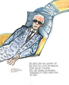 ![]() Max Baumer · Wenn Karl auf sein Lager fällt … Max Baumer widmet sich in seinen Bildern mit skurillen Unter-Texten den Eigenheiten der großen Stars der Modeszene wie dem Lächeln der Vivienne Westwood und dem Umgang Karl Lagerfelds mit dem Älterwerden. Wie zwei sehr gegensätzlich Typen auf ganz unterschiedliche Art eine Respekt-einflößende Ausstrahlung erzielen, zeigen die Bilder von Anton Atzenhofer. Der Irokesenschnitt-Punker ist ein harter Kerl mit Bierdose, Zigarette und jeder Menge Nieten und sonstigen Metallverzierungen an seiner Kleidung. Völlig ohne Hilfsmittel kommt die resolute junge Frau in Kittelschürze aus, die allein durch den strengen Blick und die Körperhaltung, mit Händen in die Hüften gestemmt, problemlos ihren Willen durchsetzen kann. |