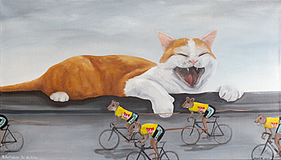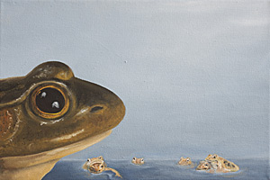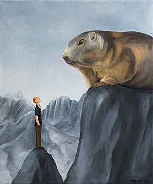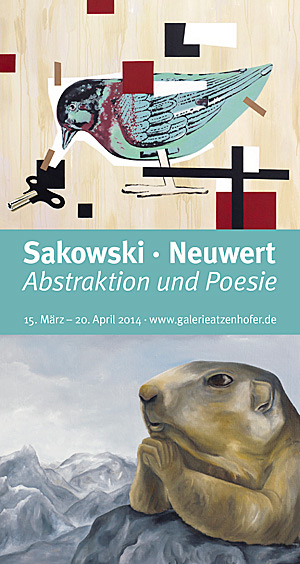 Ausstellung von 15. März bis 20. April 2014 ![]() Uschi Neuwert und Wolf Sakowski sind seit ihrem Studium der Malerei an der Nürnberger Akademie echte Kunst-Workaholics, interessieren sich darüber hinaus aber auch für gesellschaftliche und politische Fragestellungen. Ihre künstlerische Auseinandersetzung damit beschert uns eine außergewöhnlich philosophische Ausstellung. Wolf Sakowski ist ein „Lebensphilosoph“ und reflektierter Philanthrop, was ihn davor bewahrt, in den kritischen Inhalten seiner Kunst zynisch zu werden. Themen wie die Oberflächlichkeiten der Kultur- und Konsumgesellschaft werden mit sanfter Ironie in Acrylbildern dargestellt, die wie Collagen anmuten, jedoch komplett gemalt sind. Der Großstädter Sakowski ist außerdem ein Ästhet mit Faible für technische Errungenschaften, was ihn zu der umseitig abgebildeten Darstellung „einer kurzen Geschichte der Luftfahrt“ inspirierte. Während Sakowskis Arbeiten den Künstler als Kultur- und Menschenfreund outen, ist die auf dem Land lebende Malerin Uschi Neuwert in erster Linie eine Naturliebhaberin. So ist Umweltethik ein zentrales Thema der aktiven Radsportlerin und „Naturphilosophin“. Die Motive ihrer Ölgemälde handeln von dem Verlust alles Ursprünglichen in unserem Leben und von der Verdrängung der Natur durch die Zivilisation. Neuwerts Anliegen werden in pittoresken Bildern, nicht durch die Blume, sondern mittels Fuchs und Hase, die das Murmeltier grüßen, vorgebracht. Ein fast schon niedliches „Porträt eines Denkers“ zeigt das Kartenmotiv. |