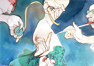 Peter Thiele und Volker Hahn wurden beide vor über 70 Jahren in Nürnberg geboren, haben Grafik studiert und sind schon ihr ganzes Leben hindurch höchst engagiert im Kunstbereich tätig. Beide favorisieren gegenständliche Malerei. Ganz wesentlich für das rundherum harmonische und sehr facettenreiche Erscheinungsbild ihrer gemeinsamen Ausstellung ist der Umstand, dass sie sich persönlich mögen und, was bei Künstlern nicht immer der Fall ist, die Arbeit des anderen sehr schätzen. So ähnlich das Lebensumfeld der beiden Nürnberger zunächst zu sein scheint, so verschieden sind sie in ihrem Wesen wie in Ihrer Herangehensweise an die künstlerische Arbeit. Professor Peter Thiele ist ein sehr überlegt arbeitender, gut strukturierter Zeichner mit klug durchdachten Ideen zu elementaren Themen der Menschheit, die er humorvoll und satirisch in illustrativen Bildern in Szene setzt. Er ist ein großer Meister der Tuschezeichnung auch in schwierigen großen Großformaten.