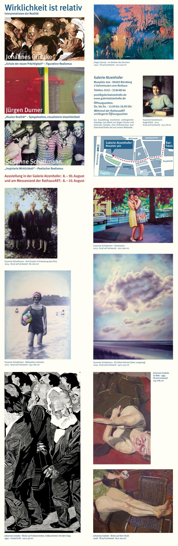 8. bis 30. August 2014 »Wirklichkeit ist relativ« Johannes Grützkes Werk wurde 2011 in einer großen Retrospektive im Germanischen Nationalmuseum gewürdigt. Als Mitbegründer der „Schule der neuen Prächtigkeit“ war er in den 1970er Jahren entscheidend daran beteiligt, die gegenständliche Malerei wieder verstärkt auf dem Kunstmarkt zu etablieren. In seiner Arbeit steht der Mensch im Vordergrund. Jürgen Durner bildet in seinen Gemälden Facetten der Wirklichkeit ab, die beinahe abstrakt anmuten: Magische Nachtszenen, faszinierende Wasser- oder Lichtreflexe, unterschiedliche Raumschichten und atemberaubende Spiegelungen.